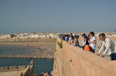 Several people sit atop the towering walls of Rabat’s casbah and look down at the beach. The mouth of the river can be seen in the photo below, and Rabat’s sister city of Sale is in the background.